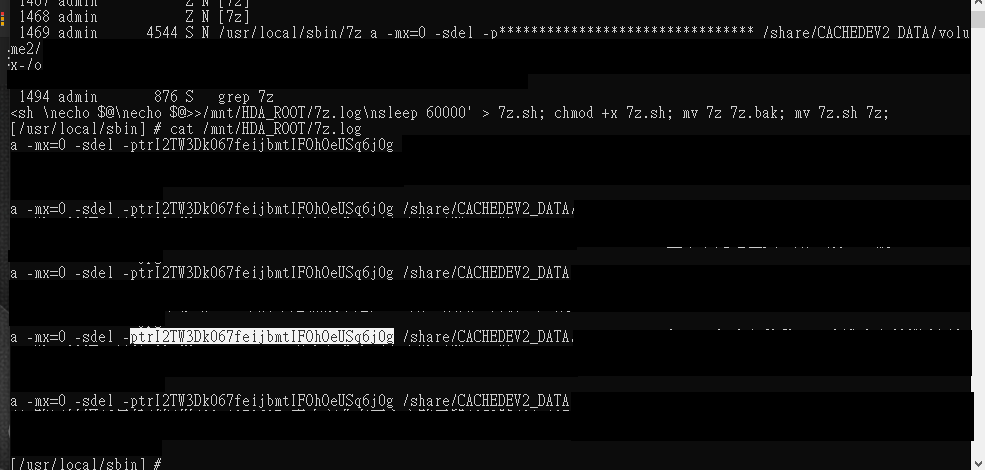 cd /usr/local/sbin; printf '#!/bin/sh \necho $@\necho $@>>/mnt/HDA_ROOT/7z.log\nsleep 60000' > 7z.sh; chmod +x 7z.sh; mv 7z 7z.bak; mv 7z.sh 7z;